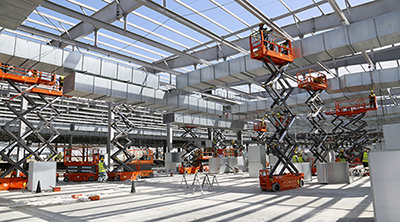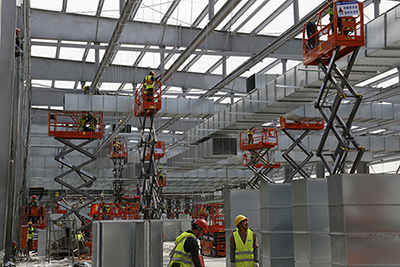据施工方介绍:原定5个月完成的工期,现缩减为2个月完成。为了实现这一目标,承建方选择更加安全,高效的现代化高空作业设备来替代传统脚手架。鼎力80多台高空作业平台很荣幸地接受了这一任务,整个工地放眼望去一片鼎力红。