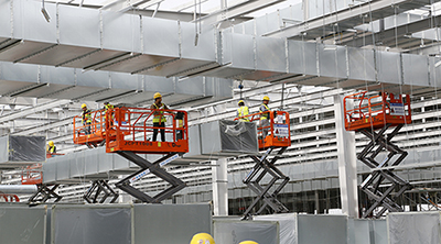 近日,山东某工地正在热火朝天忙碌着,鼎力高空作业平台正在积极地配合着工人们完成通风管道、吊顶的安装等相关工作,为加快工地建设献一份力量。