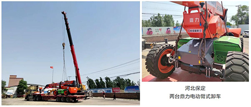 河北保定两台鼎力电动臂式卸车6月5日,经长途运输,两台鼎力电动直臂BT28ERT、BT24ERT顺利抵达目的地河北保定,完成卸车后,设备将第一时间投入使用。