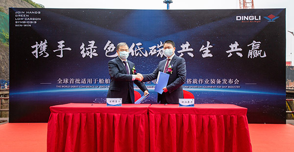 万邦船舶重工(舟山)有限公司也在多年的绿色修船改革中,创新了船舶绿色维修的新概念、新技术、新装备和科学应用体系,并进行了跨行业、跨领域的核心技术及核心装备研发应用,实现了船舶维修技术和工程作业方式的重大突破。 此次交机,无疑是中国修造船装备领域中的一次强强联合,也是双方继在2022年4月的“新浙经济贸易理事会-船舶工程机器人和机械装备研发战略合作协议”及“全球首批适用于船舶工业零碳排放全电驱智能高空搭载作业装备发布会”后的再次深入合作实践。【2022年4月,万邦重工总经理陈勇、浙江鼎力董事长许树根签署战略合作协议】
