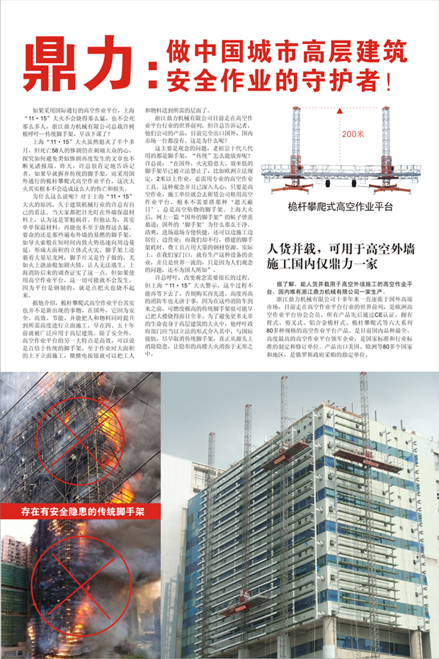 2010年12月10日,杭州日报(A6版)、钱江晚报(A14版)等各大报社以上海"11.15"大火为启示,传统的脚手架安全吗?为主题分别对浙江