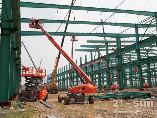 鼎力再次开启兵团作战模式,几十台高空作业平台通过国内租赁公司进驻某大型施工工地,助力钢结构厂房建设。放眼望去,耀眼的